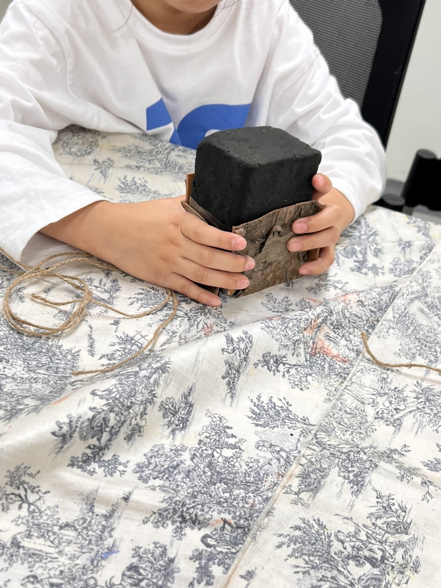 실제 나무와 나무껍질을 만져보고 촉감을 느껴봤어요. 그리고 이를 이용해 꽃바구니 대신 멋진 바구니(화기)를 만들어보았습니다.