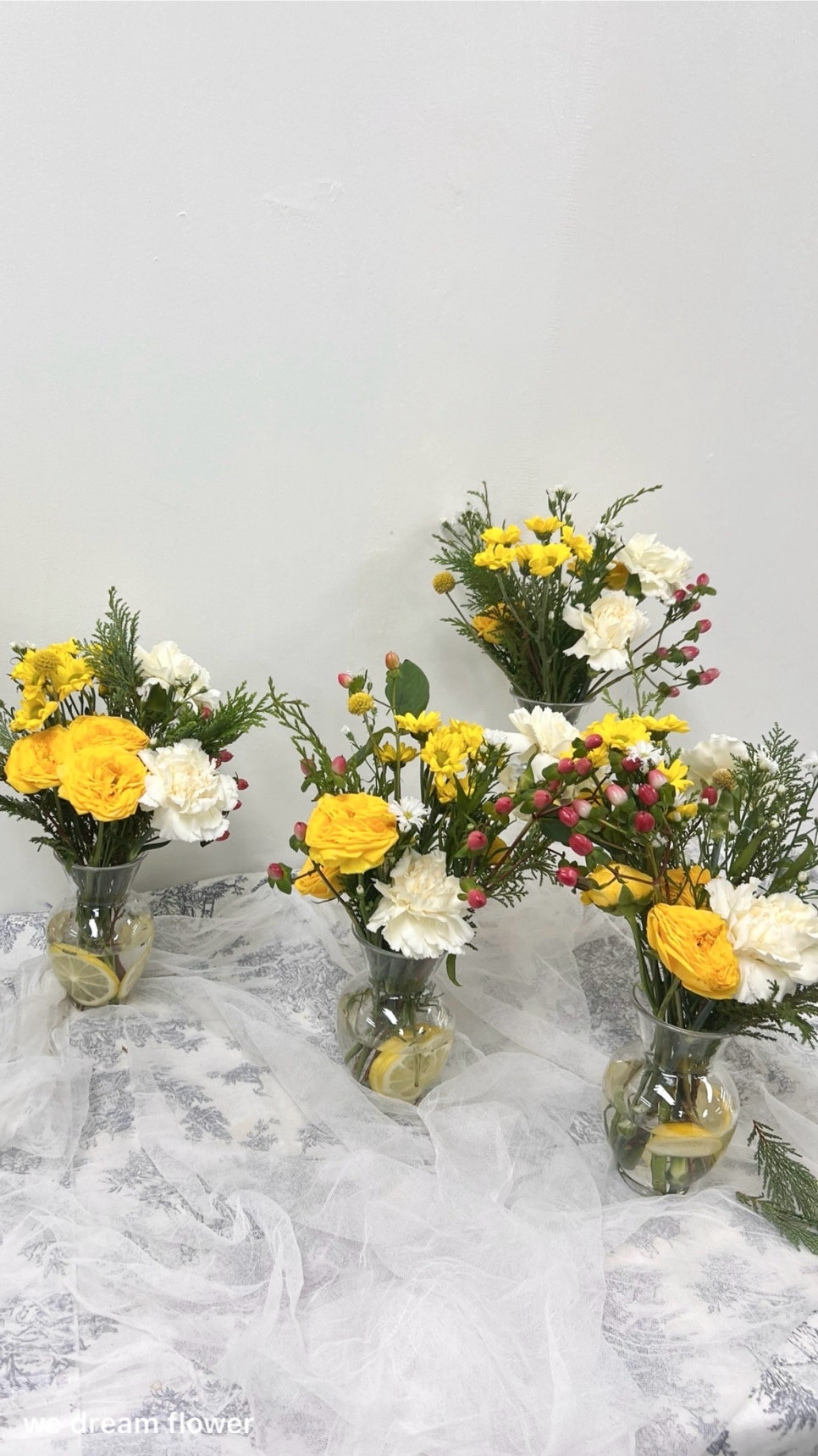 노란색 가득한 꽃을 담고, 크림색 카네이션과 빨간열매같은 하이베리콤을 넣었어요.